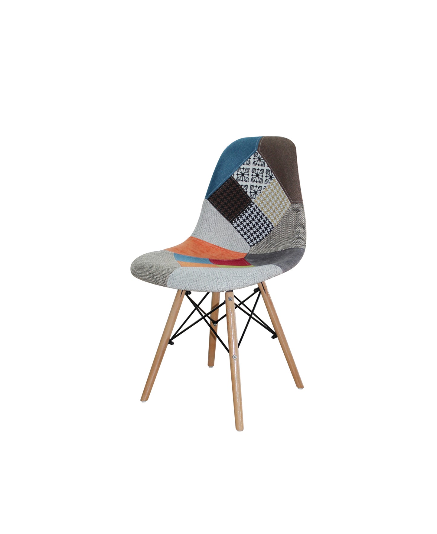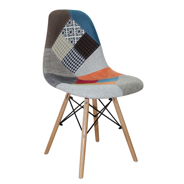 Sleek silhouette chair in a colourful patchwork fabric design. Padded chair supported by beech wood legs.