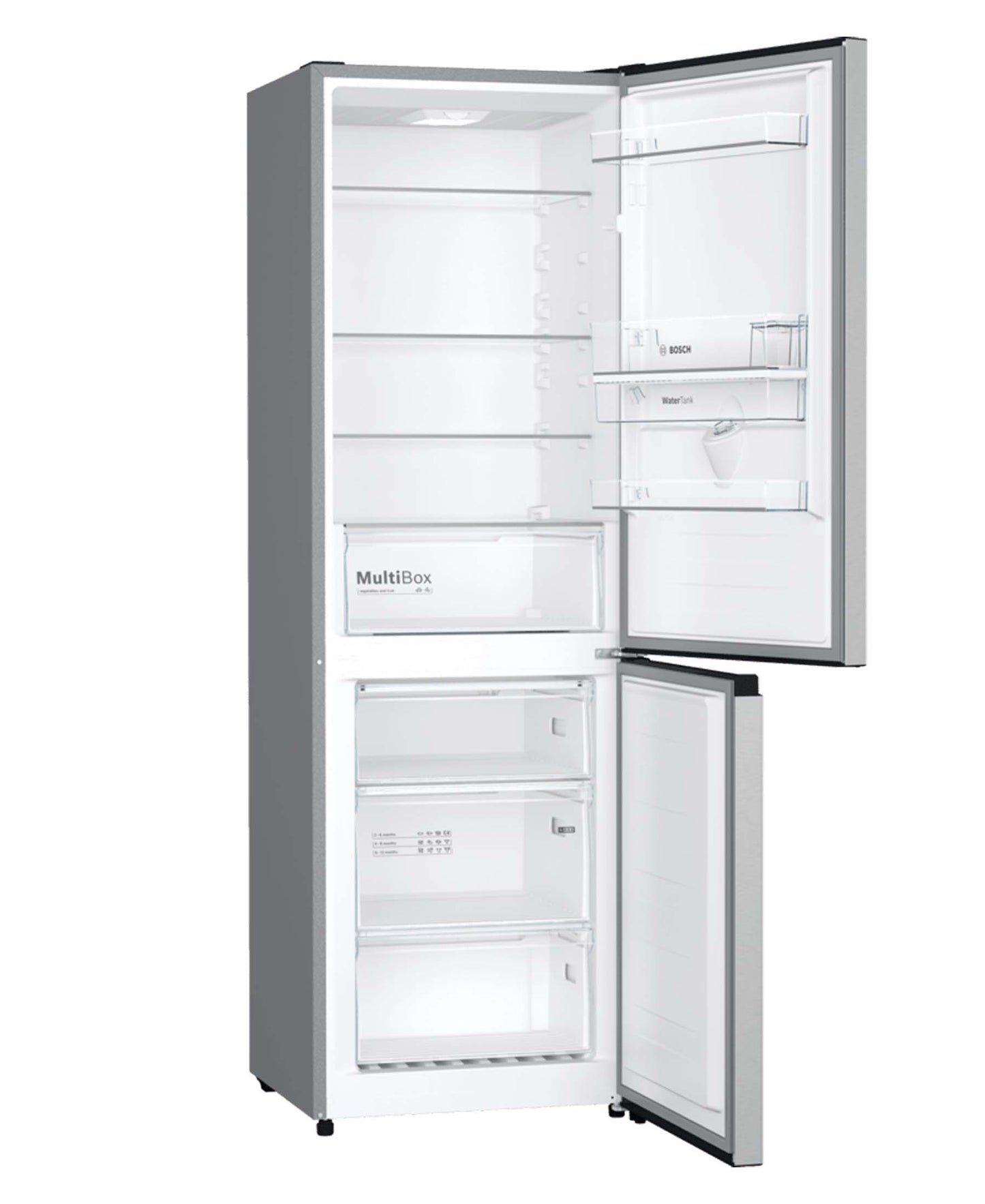 Serie | 4 Freestanding Fridge-freezer (Bottom freezer)185.9 x 59.5 cm Stainless steel look . LED light: illuminates the refrigerator evenly without glare, for the life of the appliance.. The egg rack keeps your eggs safe inside your fridge. Organized freezer drawers. Bright All LED Lighting Shines Throughout the Entire Interior. Fill your favourite glass or bottle hands-free using Bosch’s advanced BottleFill technology.