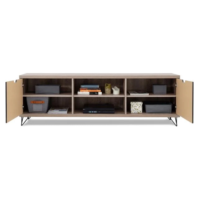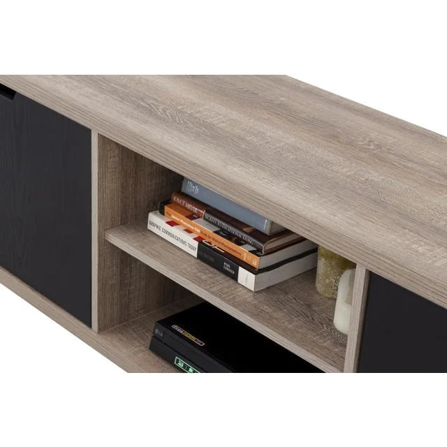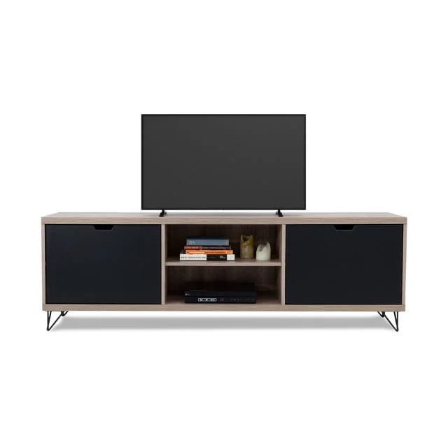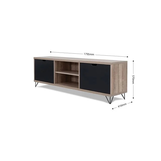 This television unit has an industrial feel to it and represents modern design at its best - from the dark woodgrain finish to the contrasting top, base and sides in light wood to the iron-look legs – it is both funky and functional.