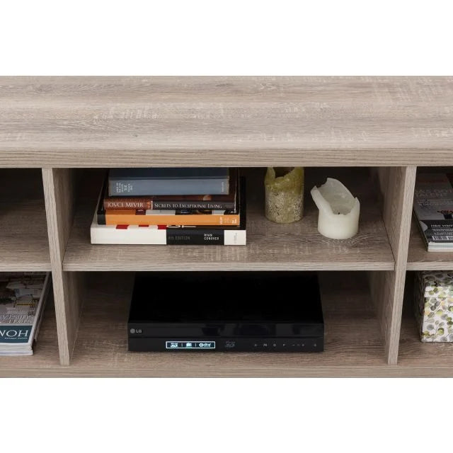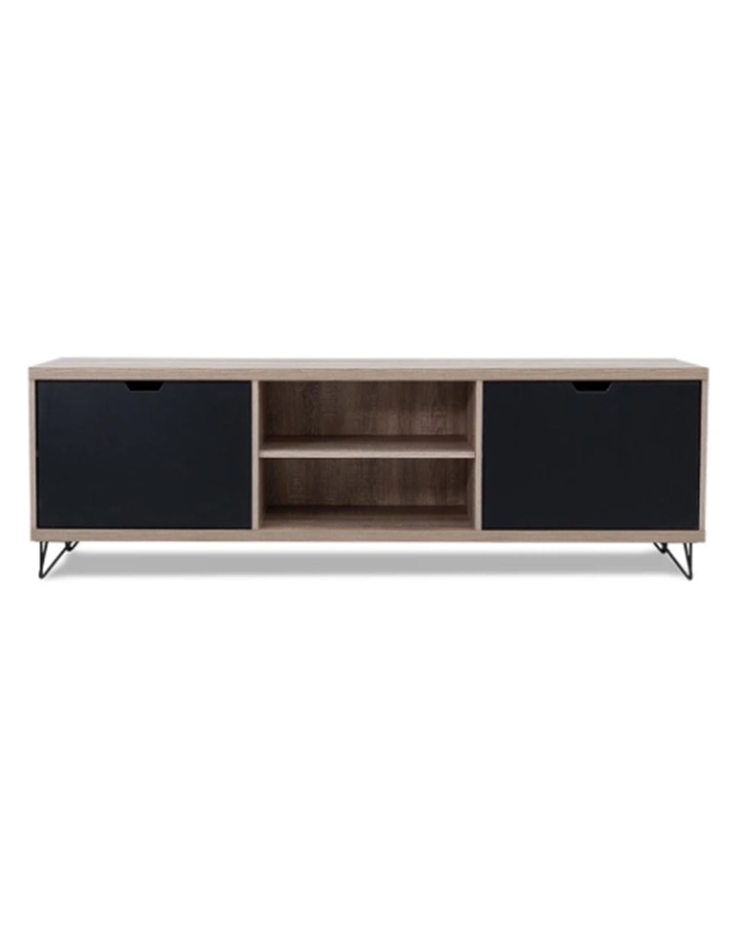 The design is clean and minimalistic with cut-out handles for opening doors. The doors open onto two storage areas with two shelves each. The middle shelves are open and are ideal for electronics or displaying ornaments.