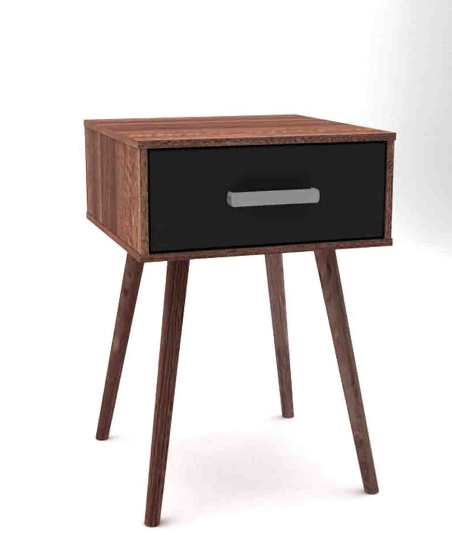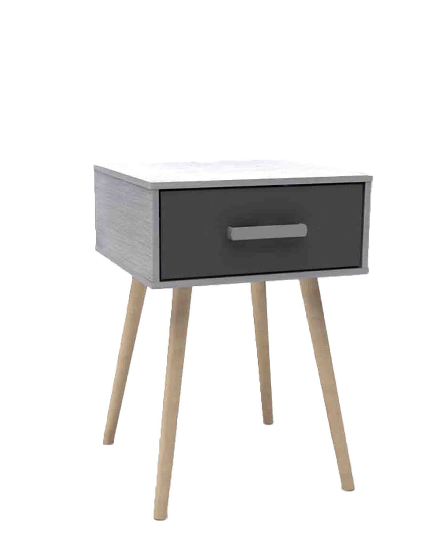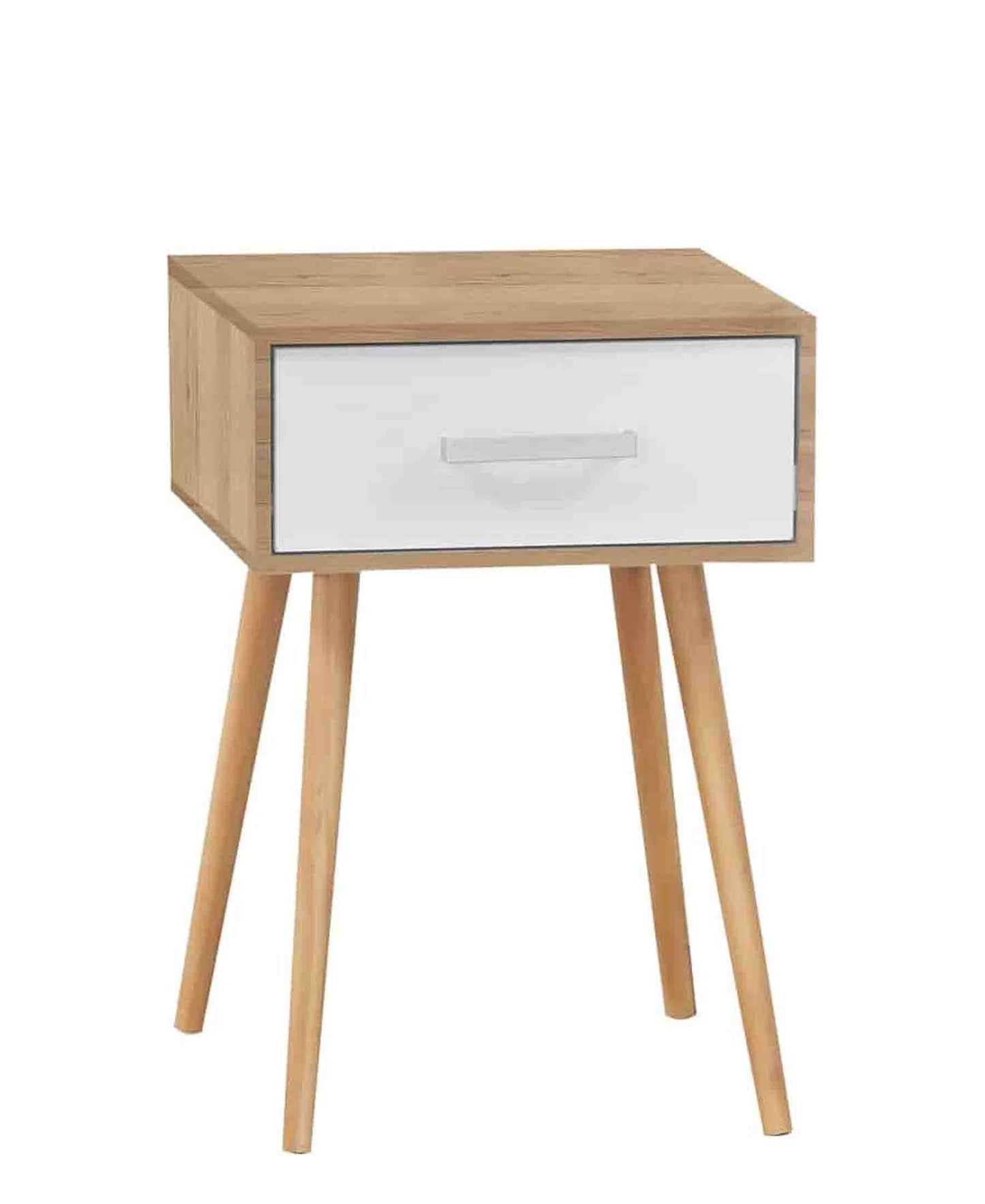 A minimalistic nightstand with a white single drawer and wooden beech legs.