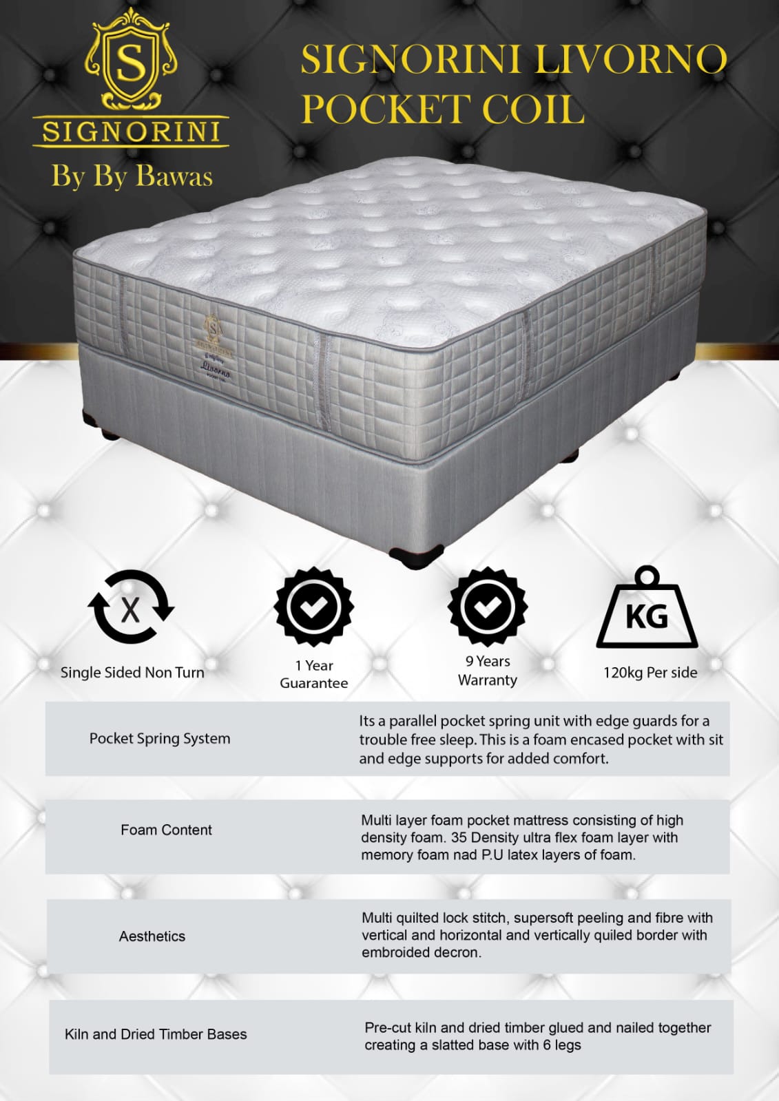 Foam content - Multi layer foam pocket mattress consisting of high density foam. 35 Density ultra flex foam layer with memory foam Nad P.U latex layers of foam.